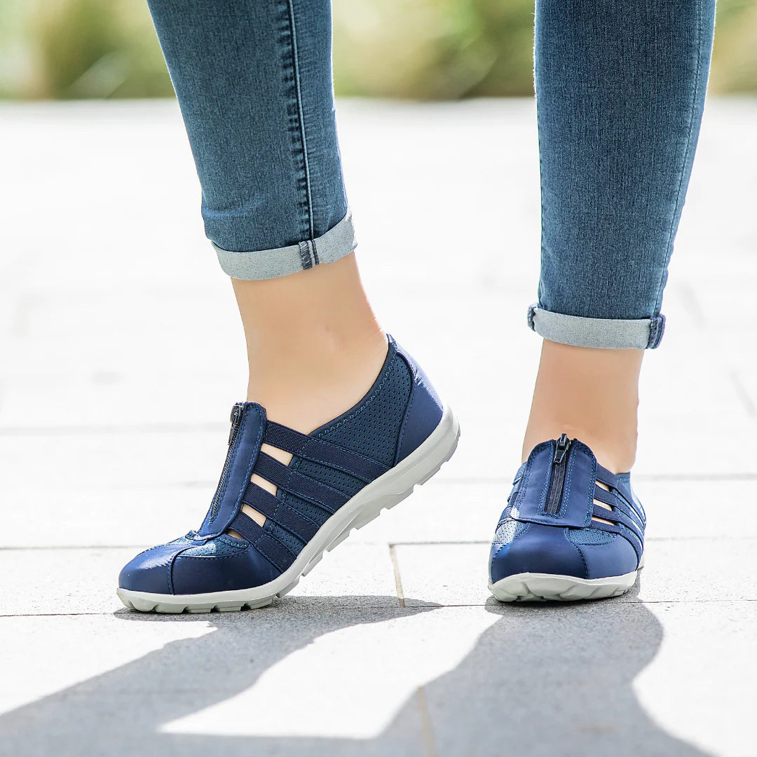 Experience unparalleled comfort with our best-seller Christine, featuring a luxuriously cushioned insole for supreme support. These comfortable, lightweight shoes boast a leather upper, complemented by a central zipper for effortless slip on. Designed with a breathable non-leather lining and a durable rubber sole, plus a removable latex sock for added convenience. Available in various designs and colors, they're perfect for women on the go, offering stylish versatility for all-year wear.