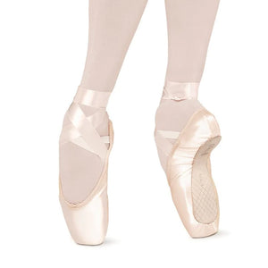 The Sonata pointe shoe shank/insole is not secured at the heel, with less resistance past the breakpoint the dancer will feel well supported and uplifted when 'en pointe'. Inside the box at the platform is a soft sponge cushion insert which gives added comfort and protection when standing 'en pointe' also acting as a shock absorber. This shoe actively supports the dancer with flexible arches under the metatarsals while still allowing the foot to arch at the three quarter. Fine cushioning under the pleats soften the sound of the box.